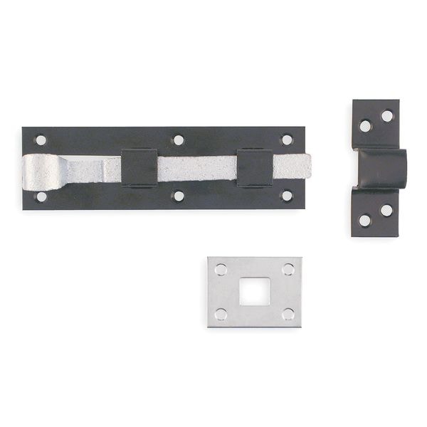 Door Bolt, Operation Type Hand Pull, Black/Galvanized Finish, Material Steel, Length 6 in, Width 1 25/32 in, Height 1 5/32 in, Bolt Length 5 51/64 in, Bolt Head Dia. 1/2 in, Throw Size 1 1/4 in, Chain Length Not Applicable, Hardware Included