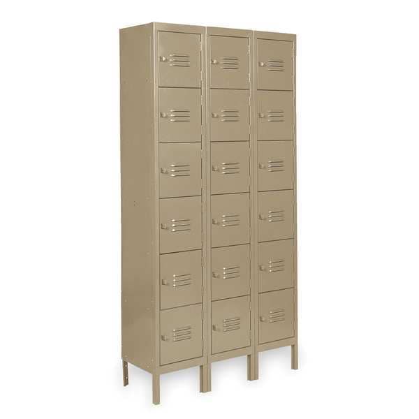 Box Locker, Audit Trail Storage None, Frame Assembled Unassembled, Number of Tiers 6, Number of Units Wide 3, Door Type Louvered, Frame Material Thickness 16 ga, Includes Number Plates No, Locker Color Tan, Lock Type Padlock Hasp, Overall Depth 18 in, Overall Height 78 in, Overall Width 36 in, Antimicrobial No, Base/Leg Height 6 in, Door Locking Points 1, Handle Type Pull, Includes Hanging Rod No, Includes Slope Top Panel No, Locker Finish Powder Coated, Locker Material Steel
