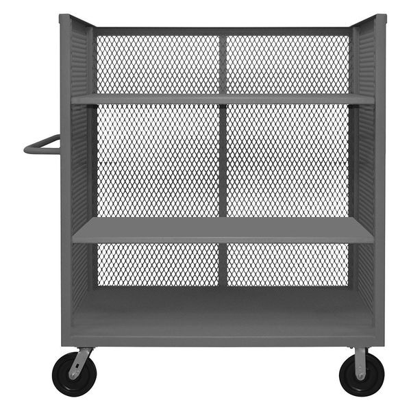 Single-Side-Access Mesh-Wall Metal Stock Truck, Load Capacity 3,000 lb, Number of Shelves 3, Shelf Length 48 in, Shelf Width 24 in, Caster Brake Type No Brake Included, Caster Wheel Dia. 6 in, Caster Wheel/Tread Material Phenolic, Caster/Wheel Configuration (2) Rigid, (2) Swivel, Caster/Wheel Mounting Location Standard, Distance Between Shelves 14 5/8 in, Finish Powder Coated, Handle Type Flat, Material Steel, Method of Construction Welded, Overall Length 24 1/2 in, Overall Width 54 1/2 in