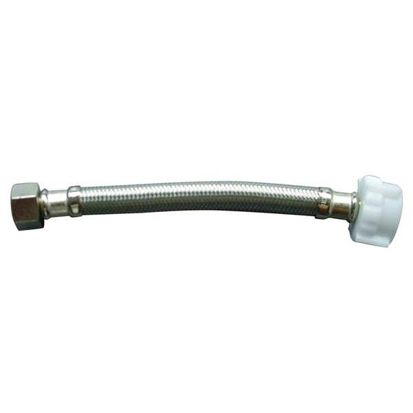 Water Connector, Hose Inside Dia. 3/8 in, Hose Outside Dia. 1/2 in, Hose Length 12 in, Hose Color Silver, Hose Tube Material PVC, Hose Cover Material 304 Stainless Steel, Max. Working Pressure @ 70 F 125 psi, Temp. Range 40 Degrees to 180 Degrees F, Standards IAPMO, NSF61, Bend Radius 2 3/8 in, Hose Fitting A Material Brass, Hose Fitting B Material Brass, Hose Fitting A Type F Compression, Hose Fitting B Type Ballcock Nut, Hose Fitting A Size 1/2 in, Hose Fitting B Size 7/8 in