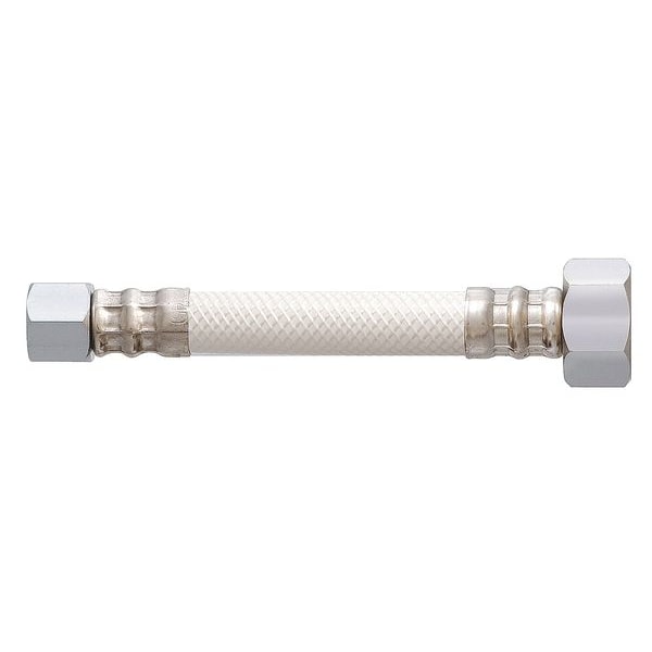 Water Connector, Hose Inside Dia. 3/8 in, Hose Outside Dia. 1/2 in, Hose Length 12 in, Hose Color White, Hose Tube Material PVC, Hose Cover Material PVC, Max. Working Pressure @ 70 F 250 psi, Temp. Range 40 Degrees to 175 Degrees F, Standards IAPMO, NSF61, Bend Radius Not Rated, Hose Fitting A Material Brass, Hose Fitting B Material Brass, Hose Fitting A Type F Compression, Hose Fitting B Type FIP, Hose Fitting A Size 3/8 in, Hose Fitting B Size 1/2 in, Hose Configuration Coupled Assembly