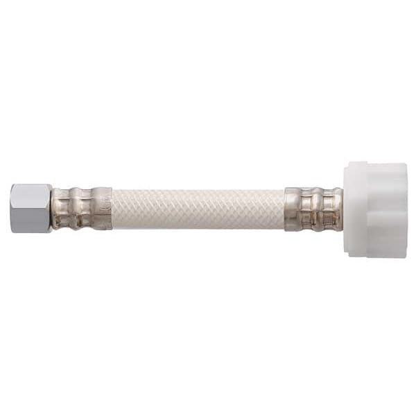 Water Connector, Hose Inside Dia. 3/8 in, Hose Outside Dia. 7/8 in, Hose Length 9 in, Hose Color White, Hose Tube Material PVC, Hose Cover Material PVC, Max. Working Pressure @ 70 F 250 psi, Temp. Range 40 Degrees to 175 Degrees F, Standards IAPMO, NSF61, Bend Radius Not Rated, Hose Fitting A Material Brass, Hose Fitting B Material PVC, Hose Fitting A Type F Compression, Hose Fitting B Type Ballcock Nut, Hose Fitting A Size 3/8 in, Hose Fitting B Size 7/8 in, Hose Configuration Coupled Assembly