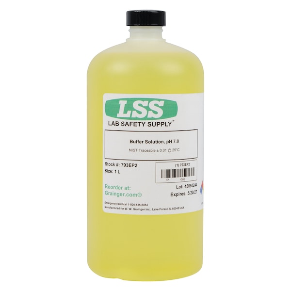 Buffer - pH 7.00 - Color Coded Yellow, Concentration pH 7, CAS Number 1310-73-2, 26628-22-8, 7732-18-5, 7778-77-0, Chemical Formula NaN3; H2O; KH2PO4, Chemical Container Material Plastic, Chemical Container Type Bottle, Chemical Grade Lab, Chemical Container Size 1 L, Chemical Family Type Buffer, Calibration Certificate NIST, Shelf Life 24 mo, Shipping Restrictions Chemical Not Regulated For Transport