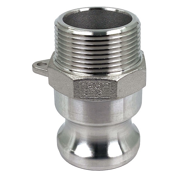 Cam and Groove Adapter, Plug, Body Material 316 Stainless Steel, Type F, Coupling Size 1 1/4 in, Male, Connection Type NPT, Hose Fitting Size 1 1/4 in, MNPT, Max. Working Pressure @ 70 F 250 psi, Plug Outside Dia. 1 51/64 in, Overall Length 2 63/64 in, Includes Locking Arm No, Thread Size 1 1/4 in-11 1/2, Plug Length 1 37/64 in