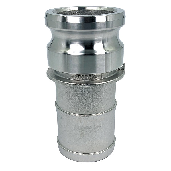 Cam and Groove Adapter, Plug, Body Material 316 Stainless Steel, Type E, Coupling Size 2 1/2 in, For Hose I.D. 2 1/2 in, Male, Connection Type Hose Shank, Hose Fitting Size 2 1/2 in, Male Hose Shank, Max. Working Pressure @ 70 F 150 psi, Plug Outside Dia. 2 63/64 in, Overall Length 5 57/64 in, Includes Locking Arm No, Plug Length 2 in