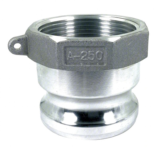 Cam and Groove Adapter, Plug, Body Material Aluminum, Type A, Coupling Size 2 1/2 in, Male, Connection Type NPT, Hose Fitting Size 2 1/2 in, FNPT, Max. Working Pressure @ 70 F 150 psi, Plug Outside Dia. 2 63/64 in, Overall Length 2 13/16 in, Includes Locking Arm No, Thread Size 2-1/2 in-8, Plug Length 2 in