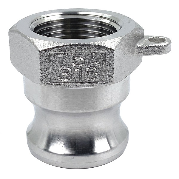 Cam and Groove Adapter, Plug, Body Material 316 Stainless Steel, Type A, Coupling Size 3/4 in, Male, Connection Type NPT, Hose Fitting Size 3/4 in, FNPT, Max. Working Pressure @ 70 F 250 psi, Plug Outside Dia. 1 17/64 in, Overall Length 1 17/32 in, Includes Locking Arm No, Thread Size 3/4 in-14, Plug Length 1 7/64 in