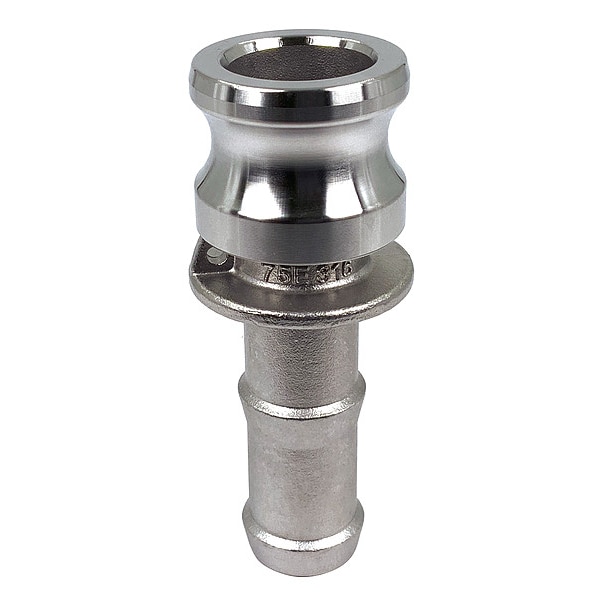 Cam and Groove Adapter, Plug, Body Material 316 Stainless Steel, Type E, Coupling Size 3/4 in, For Hose I.D. 3/4 in, Male, Connection Type Hose Shank, Hose Fitting Size 3/4 in, Male Hose Shank, Max. Working Pressure @ 70 F 250 psi, Plug Outside Dia. 1 17/64 in, Overall Length 3 25/64 in, Includes Locking Arm No, Plug Length 1 7/64 in