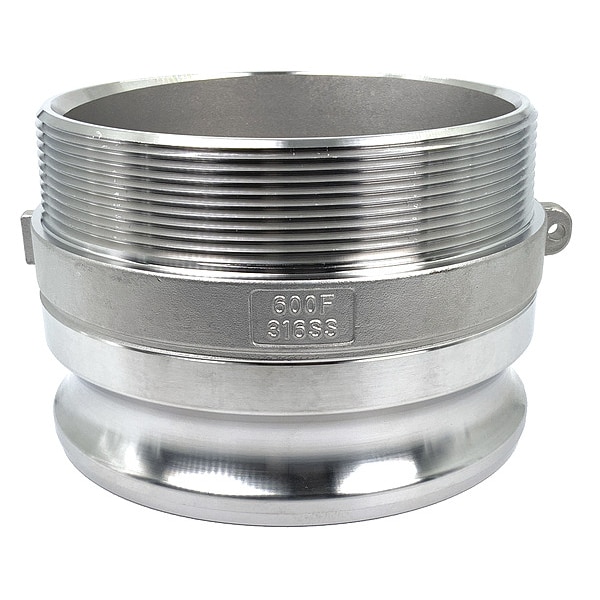 Cam and Groove Adapter, Plug, Body Material 316 Stainless Steel, Type F, Coupling Size 6 in, Male, Connection Type NPT, Hose Fitting Size 6 in, MNPT, Max. Working Pressure @ 70 F 75 psi, Plug Outside Dia. 6 59/64 in, Overall Length 4 11/16 in, Includes Locking Arm No, Thread Size 6 In.-8, Plug Length 2 5/16 in