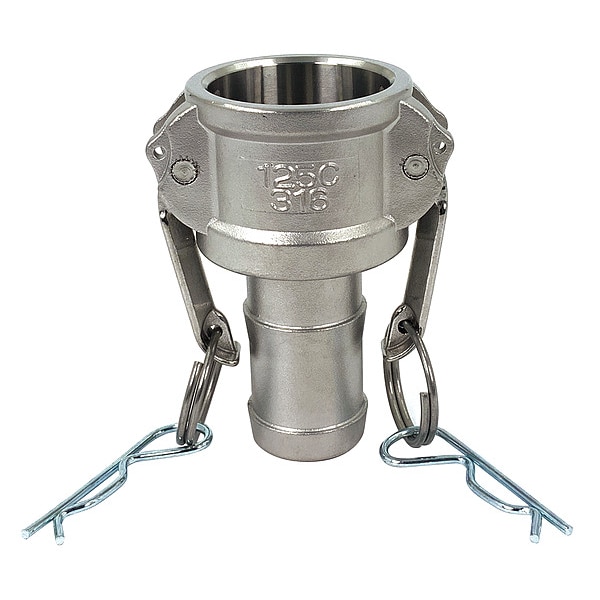 Cam and Groove Coupling, Socket, Body Material 316 Stainless Steel, Type C, Coupling Size 1 1/4 in, For Hose I.D. 1 1/4 in, Female, Connection Type Hose Shank, Hose Fitting Size 1 1/4 in, Male Hose Shank, Max. Working Pressure @ 70 F 250 psi, Socket Inside Diameter 1 13/16 in, Gasket Material Nitrile, Overall Length 4 1/16 in, Includes Locking Arm Yes