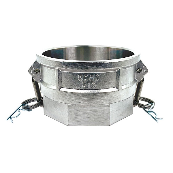 Cam and Groove Coupling, Socket, Body Material 316 Stainless Steel, Type D, Coupling Size 5 in, Female, Connection Type NPT, Hose Fitting Size 5 in, FNPT, Max. Working Pressure @ 70 F 75 psi, Socket Inside Diameter 5 3/4 in, Gasket Material Nitrile, Overall Length 3 55/64 in, Includes Locking Arm Yes, Thread Size 5 In.-8