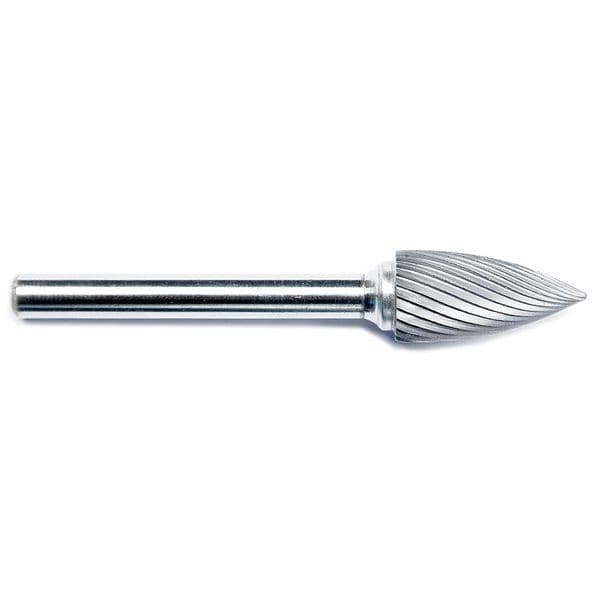 Flame Bur SH, End Type Pointed, Cut Type Single, Shank Dia. 1/4 in, Head Dia. 1/2 in, Head Length 1 1/4 in, Included Angle Not Applicable, Overall Length 3 in, Trade Number SH-5, Primary Material Application Cast Iron, Ferrous Metals, Non-Ferrous Metals, Steel, Head Shape Flame, Shank Length 1 3/4 in, Operating Speed - Maximum 40,000 RPM, Compatible Tool Type Die Grinder, Rotary Power Tool, Straight Grinder, Head Material Carbide, Head Material Grade YG7, Shank Material Steel