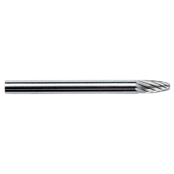 Carbide Bur, End Type Pointed, Cut Type Single, Shank Dia. 1/8 in, Head Dia. 1/8 in, Head Length 3/8 in, Included Angle 12 Degrees , Overall Length 1 1/2 in, Trade Number SM-41, Primary Material Application Cast Iron, Ferrous Metals, Non-Ferrous Metals, Steel, Head Shape Cone, Shank Length 1 1/8 in, Operating Speed - Maximum 70,000 RPM, System of Measurement Inch, Coating Bright (Uncoated), Compatible Tool Type Die Grinder, Rotary Power Tool, Straight Grinder, Head Material Carbide