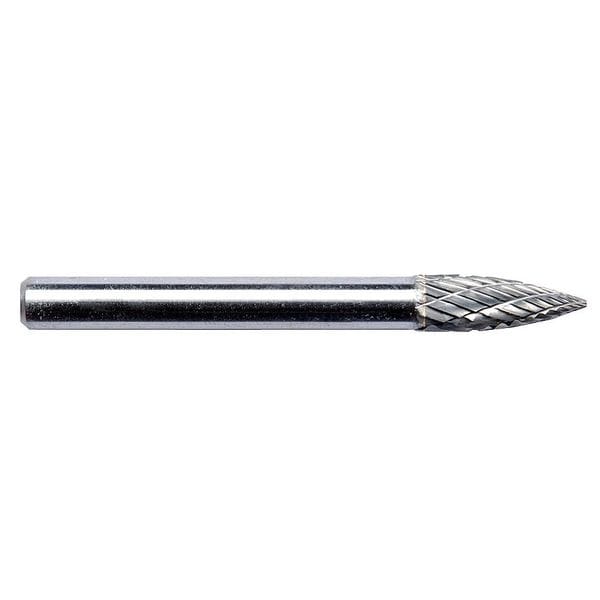 Carbide Bur, End Type Pointed, Cut Type Double, Shank Dia. 1/4 in, Head Dia. 1/4 in, Head Length 5/8 in, Included Angle Not Applicable, Overall Length 2 in, Trade Number SG-1, Primary Material Application Brass, Bronze, Cast Iron, Copper, Nickel, Stainless Steel, Steel, Titanium, Zinc, Head Shape Tree, Shank Length 1 3/8 in, Operating Speed - Maximum 30,000 RPM, System of Measurement Inch, Coating Bright (Uncoated), Compatible Tool Type Die Grinder, Rotary Power Tool, Straight Grinder