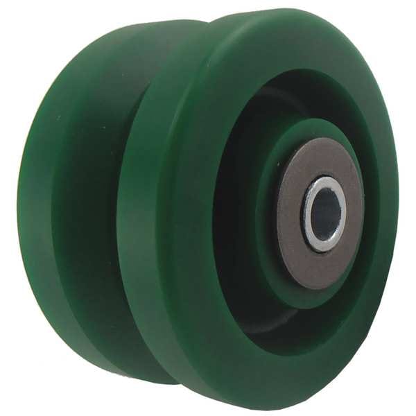 Track Wheel, 300 lb Load Rating, 300 to 999 lb, 4 in Wheel Dia., 2 in Wheel Width, Polyurethane Wheel/Tread Material, Hard Wheel/Tread Hardness Rating, 60 Shore D Wheel/Tread Hardness, Roller Wheel Bearing Type, V-Groove Tread Shape, For Axle Size 1/2 in, Yes Includes Spanner Bushing, Polyurethane Wheel Core Material, Yes Non-Marking, 2 7/16 in Hub Length