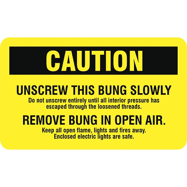 DOT Handling Label, Language English, Handling Label/Placard Type Hazardous Class, DOT/UN Product Form Label, Message Caution Unscrew this Bung Slowly, Label Width 3 in, Label Height 5 in, Material Self-Sticking, Vinyl, Labels per Roll 250, Package Quantity 25
