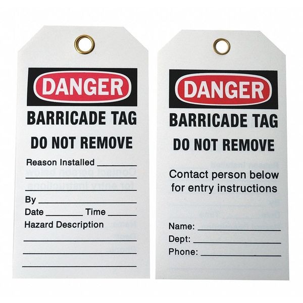 Caution Tag, Subject Matter Lockout Tagout, Sign Legend Barricade Tag Do Not Remove Contact Person Below For Entry Instructions, Name, Dept, Phone, Legend Same on Both Sides No, Sign Header Danger, Sign Header Background Color White, Shape Rectangular, Safety Tag Legend - Back Side Barricade Tag Do Not Remove Contact Person Below For Entry Instructions, Name, Dept, Phone, Sign Header -Back Side Danger, Package Quantity 25