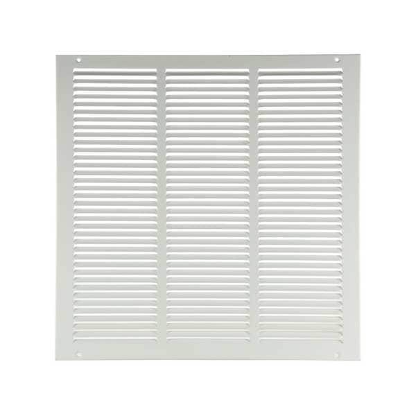 Return Air Grille, Overall Depth 1/4 in, Overall Height 17 3/4 in, Overall Width 17 3/4 in, Maximum Opening Height 16 in, Maximum Opening Width 16 in, Filter Depth Not Applicable, Filter Height Not Applicable, Filter Width Not Applicable, Grille Color White, Grille Material Steel, Material Steel, Damper Material Not Applicable, Bar Spacing 1/2 in, Face Design Louvered, Airflow Directions One-Way, Adjustable Blades No, Mounting Location Ceiling, Wall, Mounting Style Surface Mount