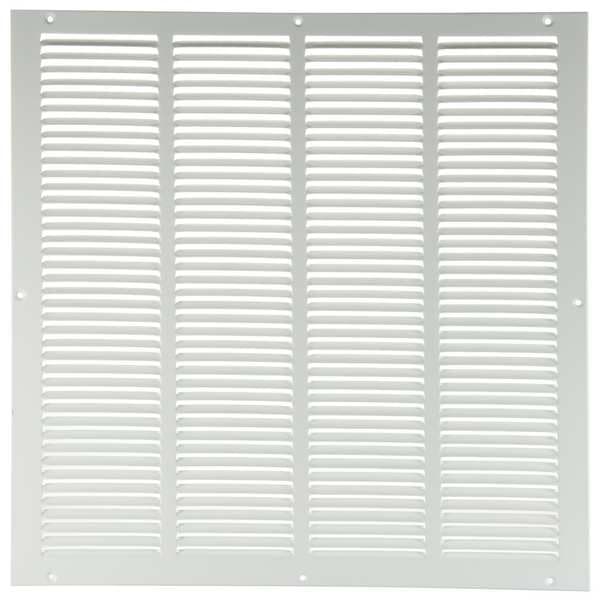 Return Air Grille, Overall Depth 1/4 in, Overall Height 21 3/4 in, Overall Width 21 3/4 in, Maximum Opening Height 20 in, Maximum Opening Width 20 in, Filter Depth Not Applicable, Filter Height Not Applicable, Filter Width Not Applicable, Grille Color White, Grille Material Steel, Material Steel, Damper Material Not Applicable, Bar Spacing 1/2 in, Face Design Louvered, Airflow Directions One-Way, Adjustable Blades No, Mounting Location Ceiling, Wall, Mounting Style Surface Mount