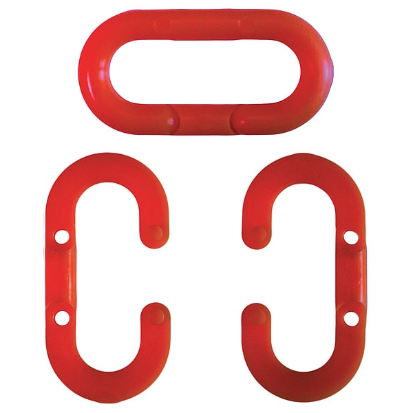 Chain Link for Plastic Chain Barrier, Product Type Master Link, For Use With 1 1/2 in Chain, Compatible Barrier Chain, Color Red, Overall Height 21/100 in, Overall Length 1 11/25 in, Overall Width 71/100 in, Outside Diameter Not Applicable, Material Polyethylene, Finish Gloss, Package Quantity 10