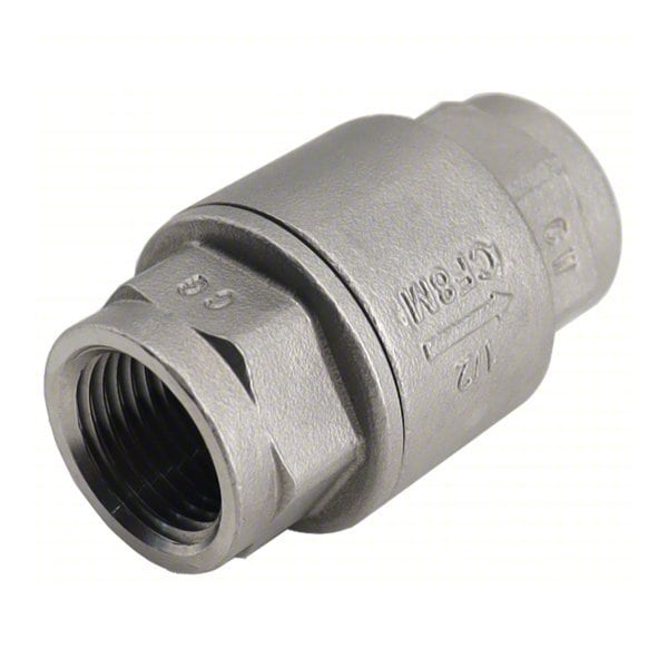 Item - Check Valves Check Valve, Flow Design Single, Mechanism and Body Design Inline Spring Piston, Body Material - Valves 316 Stainless Steel, Pipe or Tube Size 1 in, Connection Type FNPT x FNPT, Cracking Pressure 0.435 psi, Mounting Orientation Vertical, Seal Material PTFE/PTFE+15 Percent Glass Fiber/PTFE+ 25 PercentCarbon/TFM1600, Max. Temp. - Valves 302 Degrees F, Min. Temp. - Valves -20 Degrees F, Max. Water Pressure - Valves 200 psi, Max. Steam Pressure - Valves 60 psi WSP