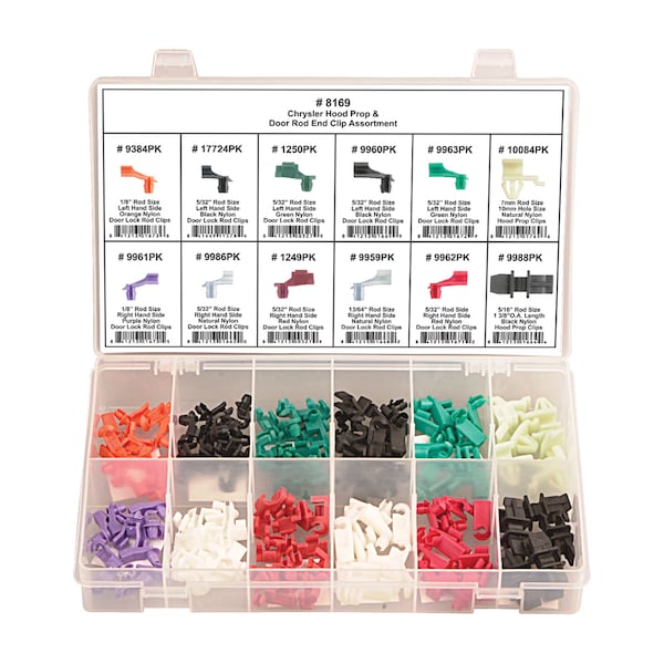 Chrylser Hood Prop and Rod End Assortment, Compatible with Vehicle Make Chrylser, Fastener Material Nylon, Assortment Type Nylon Door Lock Rod Clip, Nylon Hood Prop Clip, Includes (12) Black Nylon Door Lock Rod Clips 5/32 in Rod Size Left Hand Side CHRYLSER # 4717165, (12) Green Nylon Door Lock Rod Clips 5/32 in Rod Size Left Hand Side CHRYLSER, (12) Orange Nylon Door Lock Rod Clips 1/8 in Rod Size Left Hand Side CHRYLSER # 4658445