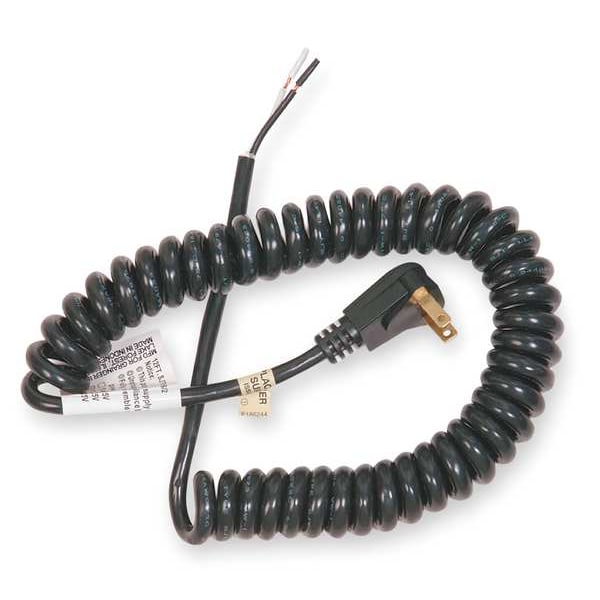 Coiled Power Cord, Wire Size 16 AWG, Number of Conductors 2, Jacket Material PVC, Jacket Color Black, Connection Type Bare Leads, Cord Length 10 ft, Voltage 125V AC, Plug Configuration Right Angle NEMA 1-15P, Max. Amps 13 A, Cord Shape Coil, Temp. Rating 32 Degrees to 167 Degrees F, Trade Designation SJT, Nominal Outside Dia. 0.32 in
