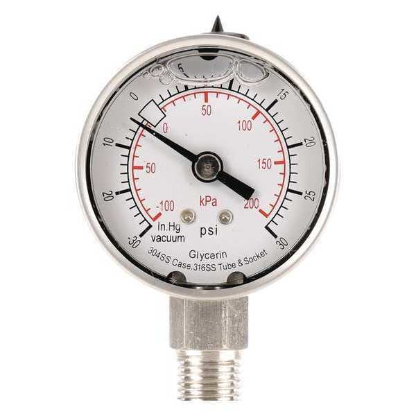 Commercial Compound Gauge, Nominal Dial Size 2 in, Accuracy +/-3-2-3 Percent, Gauge Case Material 304 Stainless Steel, Process Connection Type NPT, Process Connection Gender Male, Lens Material Acrylic, Process Connection Size 1/4 in, Field Fillable No, Process Connection Location Bottom, Case Color Silver, IP/NEMA Rating Not Rated, Primary Pressure Range 30 to 0 to 30, Dry Dampening Feature None, Vibration Resistance Liquid-Filled, Dial Color White, Pressure Gauge Type Commercial Pressure Gauge