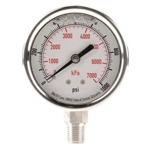 Commercial Pressure Gauge, Nominal Dial Size 2 1/2 in, Accuracy +/-3-2-3 Percent, Gauge Case Material 304 Stainless Steel, Process Connection Type NPT, Process Connection Gender Male, Lens Material Acrylic, Process Connection Size 1/4 in, Field Fillable No, Process Connection Location Bottom, Case Color Silver, IP/NEMA Rating Not Rated, Primary Pressure Range 0 to 1,000, Dry Dampening Feature None, Vibration Resistance Liquid-Filled, Dial Color White