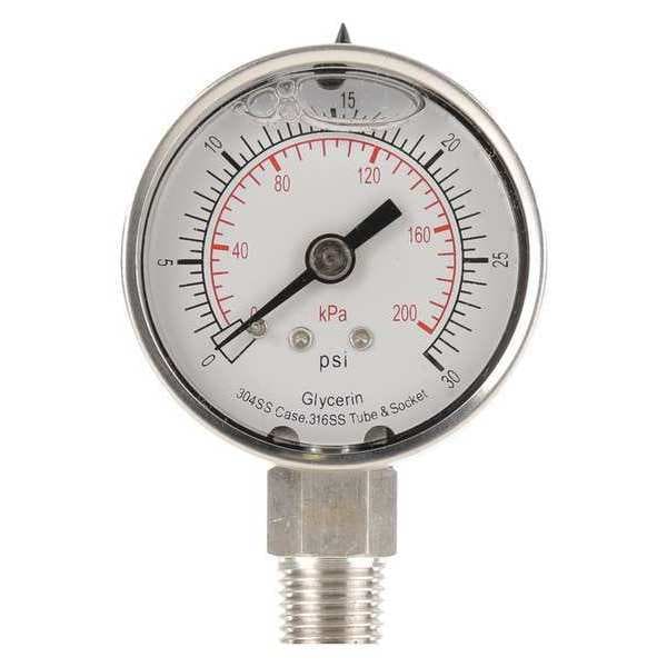 Commercial Pressure Gauge, Nominal Dial Size 2 in, Accuracy +/-3-2-3 Percent, Gauge Case Material 304 Stainless Steel, Process Connection Type NPT, Process Connection Gender Male, Lens Material Acrylic, Process Connection Size 1/4 in, Field Fillable No, Process Connection Location Bottom, Case Color Silver, IP/NEMA Rating Not Rated, Primary Pressure Range 0 to 30, Dry Dampening Feature None, Vibration Resistance Liquid-Filled, Dial Color White, Pressure Gauge Type Commercial Pressure Gauge