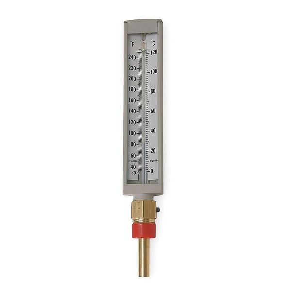 Industrial Thermometer, 30 Degrees to 240 Degrees F/0 Degrees to 120 Degrees C, 1/2 in MNPT Thermometer x 1/2 in MNPT Thermowell, Bottom, 6 in Scale Length, Thermowell Material Brass, Shank Type Straight, Blue, 2 Degrees F, 2 Degrees C Graduations, Liquid-in-Glass