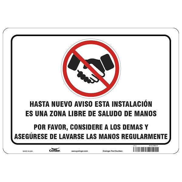 Covid 19 Sign 10X14, Spanish Handshake F, Sign Subject Matter Coronavirus Prevention, Height 10 in, Width 14 in, Sign Material Polystyrene, Sign Mounting Style With Mounting Holes, Header No Header, Legend Hasta Nuevo Aviso Esta Instalación Es Una Zona Libre De Saludo De Manos; Por Favor, Considere A Los Demas Y Asegúrese De Lavarse Las Manos Regularmente, Printed Language Spanish