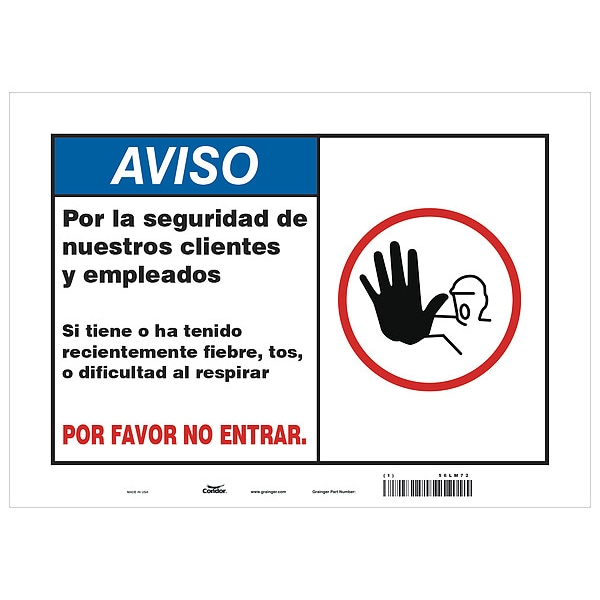 Covid 19 Sign 10X14, Spanish Symptoms Do, Sign Subject Matter Coronavirus Prevention, Height 10 in, Width 14 in, Sign Material Polyester, Sign Mounting Style Adhesive Surface, Header Aviso, Legend Por La Seguridad De Nuestros Clientes Y Empleados; Si Tiene O Ha Tenido Recientemente Fiebre, Tos, O Dificultad De Respirar; Por Favor No Entrar., Printed Language Spanish