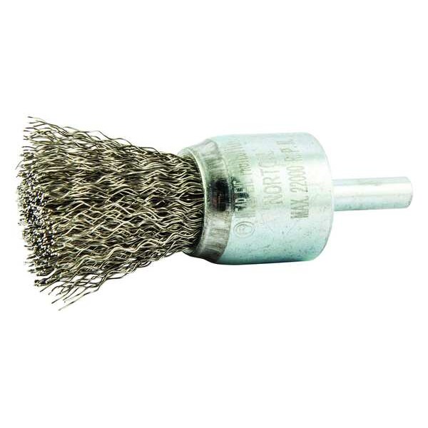 End Brush, Product Type End Brush, Quick Change System Not Applicable, Bristle Type Crimped Wire, Bristle Material Stainless Steel, Brush Dia. 1 in, Wire Dia. 0.005 in, Bristle Length 1 in, Grit Not Applicable, Overall Length 2 3/4 in, Compatible Tool Type Straight Grinder, Drill Press, Impact Driver, Pencil Grinder, Color Not Applicable, Primary Material Application Aluminum, Brass, Copper, Stainless Steel, Wood, Connector Type Round Shank, Connector Size 1/4 in
