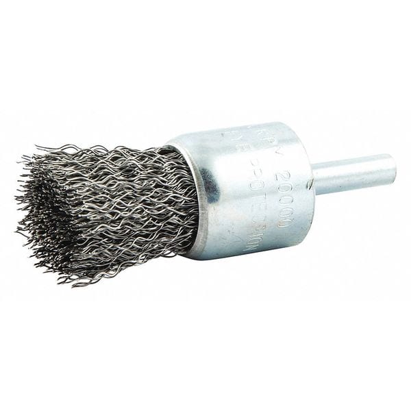 End Brush, Product Type End Brush, Quick Change System Not Applicable, Bristle Type Crimped Wire, Bristle Material Carbon Steel, Brush Dia. 1 in, Wire Dia. 0.014 in, Bristle Length 3/4 in, Grit Not Applicable, Overall Length 1 5/8 in, Compatible Tool Type Straight Grinder, Drill Press, Impact Driver, Pencil Grinder, Color Not Applicable, Primary Material Application Carbon Steel, Cast Iron, Wood, Connector Type Round Shank, Connector Size 1/4 in, Operating Speed - Maximum 20,000 RPM