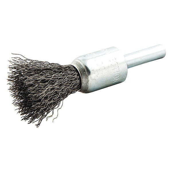End Brush, Product Type End Brush, Quick Change System Not Applicable, Bristle Type Crimped Wire, Bristle Material Carbon Steel, Brush Dia. 1/2 in, Wire Dia. 0.01 in, Bristle Length 1 in, Grit Not Applicable, Overall Length 2 3/4 in, Compatible Tool Type Straight Grinder, Drill Press, Impact Driver, Pencil Grinder, Color Not Applicable, Primary Material Application Carbon Steel, Cast Iron, Wood, Connector Type Round Shank, Connector Size 1/4 in, Operating Speed - Maximum 25,000 RPM