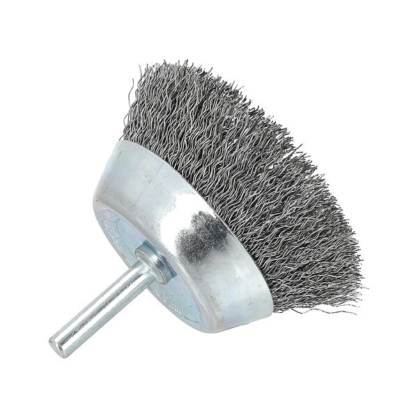 Cup Brush, Product Type Cup Brush, Quick Change System Not Applicable, Bristle Type Crimped Wire, Bristle Material Carbon Steel, Brush Dia. 3 in, Wire Dia. 0.012 in, Bristle Length 1 in, Grit Not Applicable, Overall Length Not Applicable, Compatible Tool Type Drill, Drill Press, Color Silver, Primary Material Application Carbon Steel, Steel, Wood, Connector Type Shank, Connector Size 1/4 in, Operating Speed - Maximum 4,500 RPM