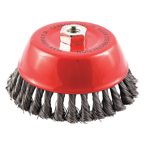 Cup Brush, Product Type Cup Brush, Quick Change System Not Applicable, Bristle Type Standard Twist Knot Wire, Bristle Material Carbon Steel, Brush Dia. 6 in, Wire Dia. 0.014 in, Bristle Length 1 1/4 in, Grit Not Applicable, Overall Length Not Applicable, Compatible Tool Type Right-Angle Grinder, Color Not Applicable, Connector Type Threaded Hole, Connector Size 5/8 In.-11, Operating Speed - Maximum 6,500 RPM, Shank Length Not Applicable
