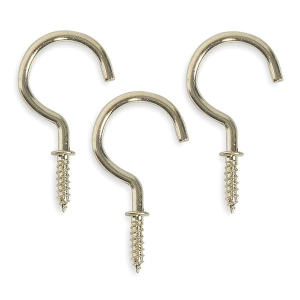 Single Point Hook, Fastening Method Screw In, Points per Hook 1, Number of Hooks 1, Basic Hook Material Steel, Hook Finish Brass, Hook Height 1 3/4 in, Hook Base Width 1 in, Projection 1 1/2 in, Brass, Thread Size Not Applicable, Weight 4.5, Thread Length 1/2 in, Includes Not Applicable, Mounting Screw-In, Overall Length 1 7/8 in, Package Quantity 20
