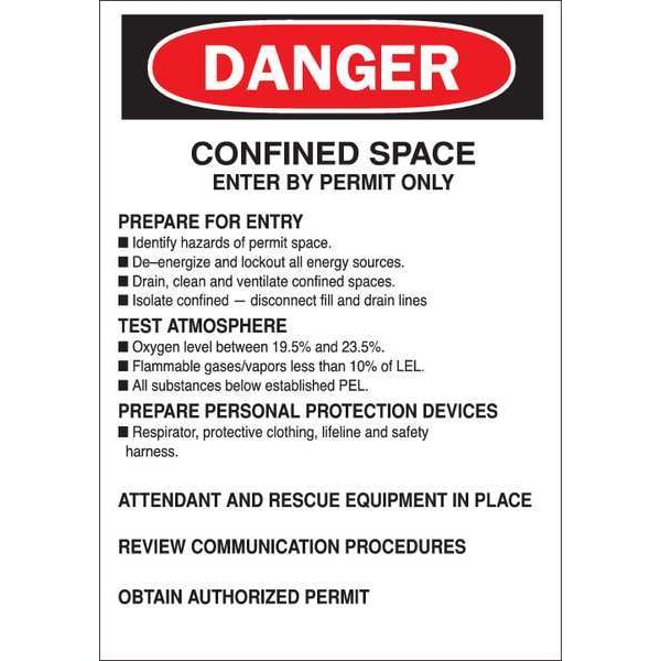 Danger Sign, 10 in H x 7 in W, Plastic, Confined Space Enter By Permit Only