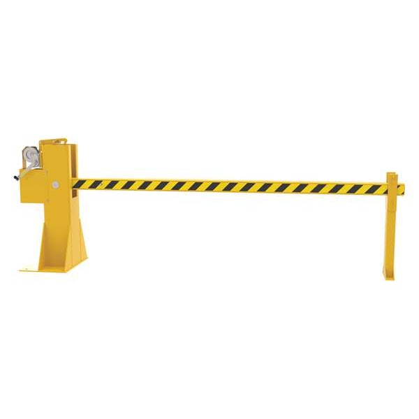 Dock Barricade, Mechanical Hand Winch, Fits Door Width 8 ft, Overall Length 133 1/4 in, Raised Arm Height 149 in, Lowered Arm Height 32 in, Base Dimension 24 in x 24 in, Base Material Steel, Color Yellow, Includes Hand Crank Winch with Counter Balance