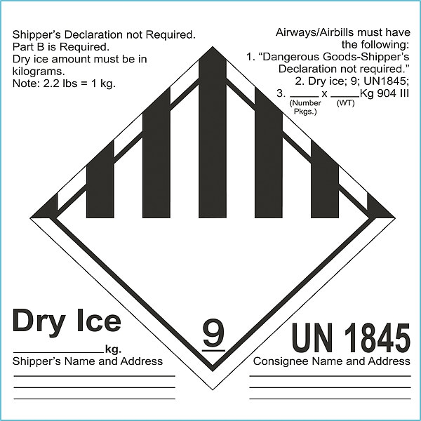 UN Container Label, Container Label/Placard Type UN, Hazard Class Class 9 (Miscellaneous Hazardous Material), DOT/UN Product Form Label, Message Dry Ice, Label Width 6 1/2 in, Label Height 6 1/2 in, Material Paper, Package Quantity 100