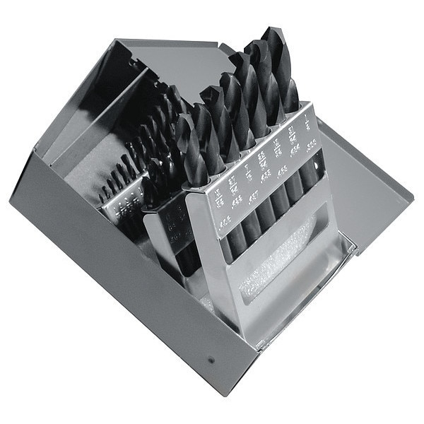 Screw Machine Drill Bit Set, Number of Drill Bits 29, 135 Degrees Drill Bit Point Angle, High Speed Steel, Black Oxide, Drill Bit Sizes Included 1/16 in, 1/2 in, 1/4 in, 1/8 in, 11/32 in, 11/64 in, 13/32 in, 13/64 in, 15/32 in, 15/64 in, 17/64 in, 19/64 in, 21/64 in, 23/64 in, 25/64 in, 27/64 in, 29/64 in, 3/16 in, 3/32 in, 3/8 in, 31/64 in, 5/16 in, 5/32 in, 5/64 in, 7/16 in, 7/32 in, 7/64 in, 9/32 in, 9/64 in, Fractional Inch, Drill Bit Point Type Split Point