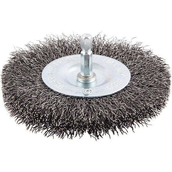 Wire Wheel Brush, Bristle Type Crimped Wire, Product Type Wire Wheel Brush, Bristle Material Carbon Steel, Brush Dia. 4 in, Grit Not Applicable, Face Width 9/16 in, Bristle Diameter 0.012 in, Bristle Length 15/16 in, Compatible Tool Type Die Grinder, Drill Press, Pencil Grinder, Straight Grinder, Connector Type Round Shank, Connector Size 1/4 in, Operating Speed - Maximum 4,500 RPM, Color Not Applicable