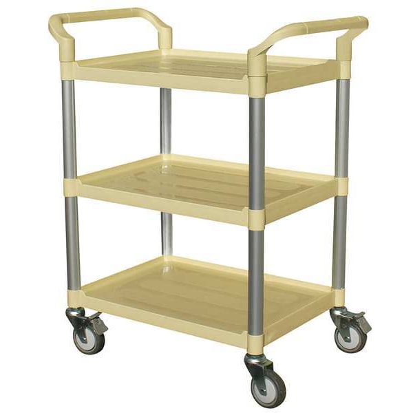 Utility Cart, Number of Shelves 3, Lip Style 4-Sided Lipped, Load Capacity 250 lb, Shelf Length 24 in, Shelf Width 18 in, Top Shelf Height 33 in, Distance Between Shelves 11 in, Distance Between Top and Middle Shelf 11 in, Distance Between Middle and Bottom Shelf 11 in, Handle Type Raised (2), Handle Height 38 1/4 in, Caster Brake Type Face Contact Brake, Caster Wheel/Tread Material Thermoplastic Rubber, Caster Wheel Dia. 4 in, Caster/Wheel Configuration (2) Swivel, (2) Swivel with Brake