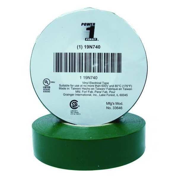 Electrical Tape, General Purpose, Vinyl, Tape Adhesive Material Rubber, 3/4 in, 22 yd, 7 mil, Approved Vendor, Series Premium, Green, Minimum Tape Performance Temperature 30 Degrees F, Maximum Tape Performance Temperature 220 Degrees F, Voltage Rating 600 V, Continuous Roll, Single-Sided