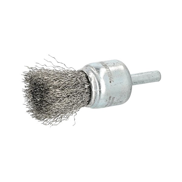 End Brush, Product Type End Brush, Quick Change System Not Applicable, Bristle Type Crimped Wire, Bristle Material Stainless Steel, Brush Dia. 1 in, Wire Dia. 0.012 in, Bristle Length 1 3/16 in, Grit Not Applicable, Overall Length 2 1/4 in, Compatible Tool Type Drill, Drill Press, Color Silver, Primary Material Application Aluminum, Stainless Steel, Connector Type Shank, Connector Size 1/4 in, Operating Speed - Maximum 22,000 RPM