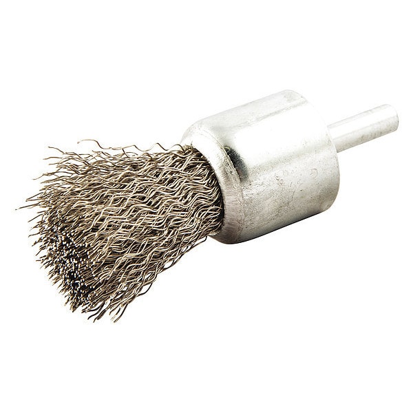 End Brush, Product Type End Brush, Quick Change System Not Applicable, Bristle Type Crimped Wire, Bristle Material Stainless Steel, Brush Dia. 1 in, Wire Dia. 0.01 in, Bristle Length 1 in, Grit Not Applicable, Overall Length 3 in, Compatible Tool Type Straight Grinder, Drill Press, Impact Driver, Pencil Grinder, Color Not Applicable, Primary Material Application Aluminum, Brass, Copper, Stainless Steel, Wood, Connector Type Round Shank, Connector Size 1/4 in, Operating Speed - Maximum 22,000 RPM
