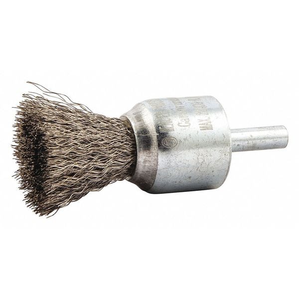 End Brush, Product Type End Brush, Quick Change System Not Applicable, Bristle Type Crimped Wire, Bristle Material Stainless Steel, Brush Dia. 1 in, Wire Dia. 0.008 in, Bristle Length 1 in, Grit Not Applicable, Overall Length 3 in, Compatible Tool Type Straight Grinder, Drill Press, Impact Driver, Pencil Grinder, Color Not Applicable, Primary Material Application Aluminum, Brass, Copper, Stainless Steel, Wood, Connector Type Round Shank, Connector Size 1/4 in