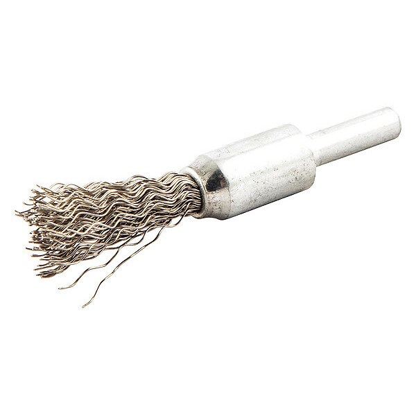End Brush, Product Type End Brush, Quick Change System Not Applicable, Bristle Type Crimped Wire, Bristle Material Stainless Steel, Brush Dia. 1/2 in, Wire Dia. 0.012 in, Bristle Length 7/8 in, Grit Not Applicable, Overall Length 2 1/2 in, Compatible Tool Type Straight Grinder, Drill Press, Impact Driver, Pencil Grinder, Color Not Applicable, Primary Material Application Aluminum, Brass, Copper, Stainless Steel, Wood, Connector Type Round Shank, Connector Size 1/4 in